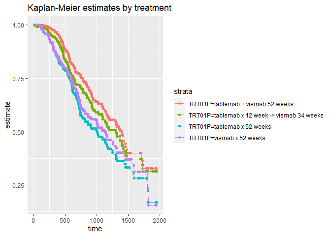 survfit(Surv(AVAL, CNSR == 0) ~ TRT01P , data = ADTTE ) %>%