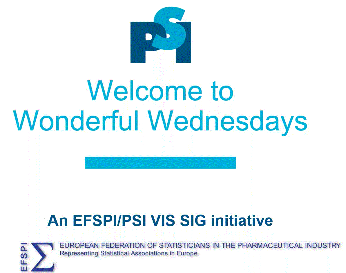 The VIS SIG is happy to introduce a new initiative called “Wonderful Wednesdays”. This initiative will provide the participants to not only learn theoretically about visualisation principles but also apply them to relevant examples from the field of healthcare and the development of new therapies. This webinar kicks off the webinar series by giving an introduction into principles of visualization and an overview of the process. The first dataset is also introduced.