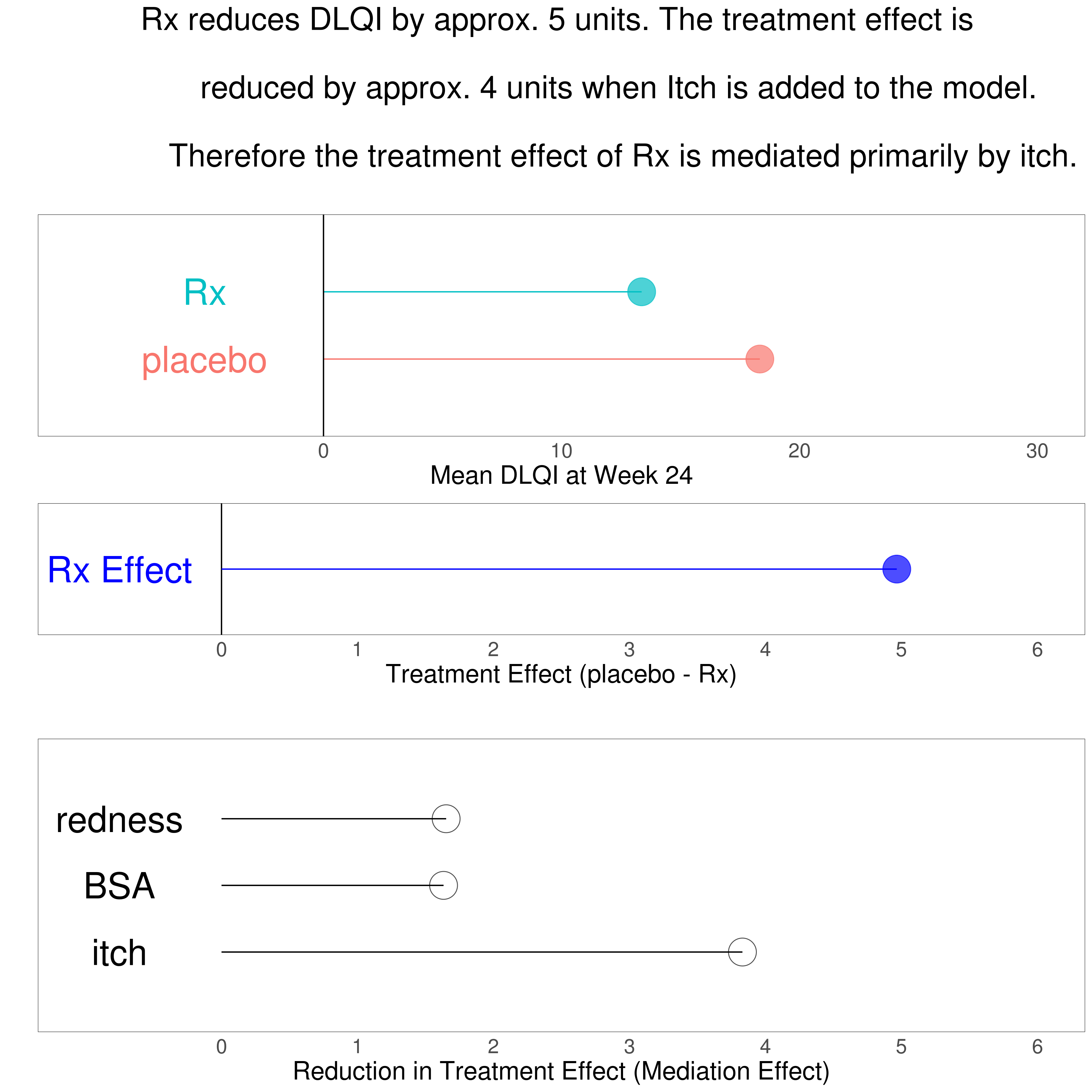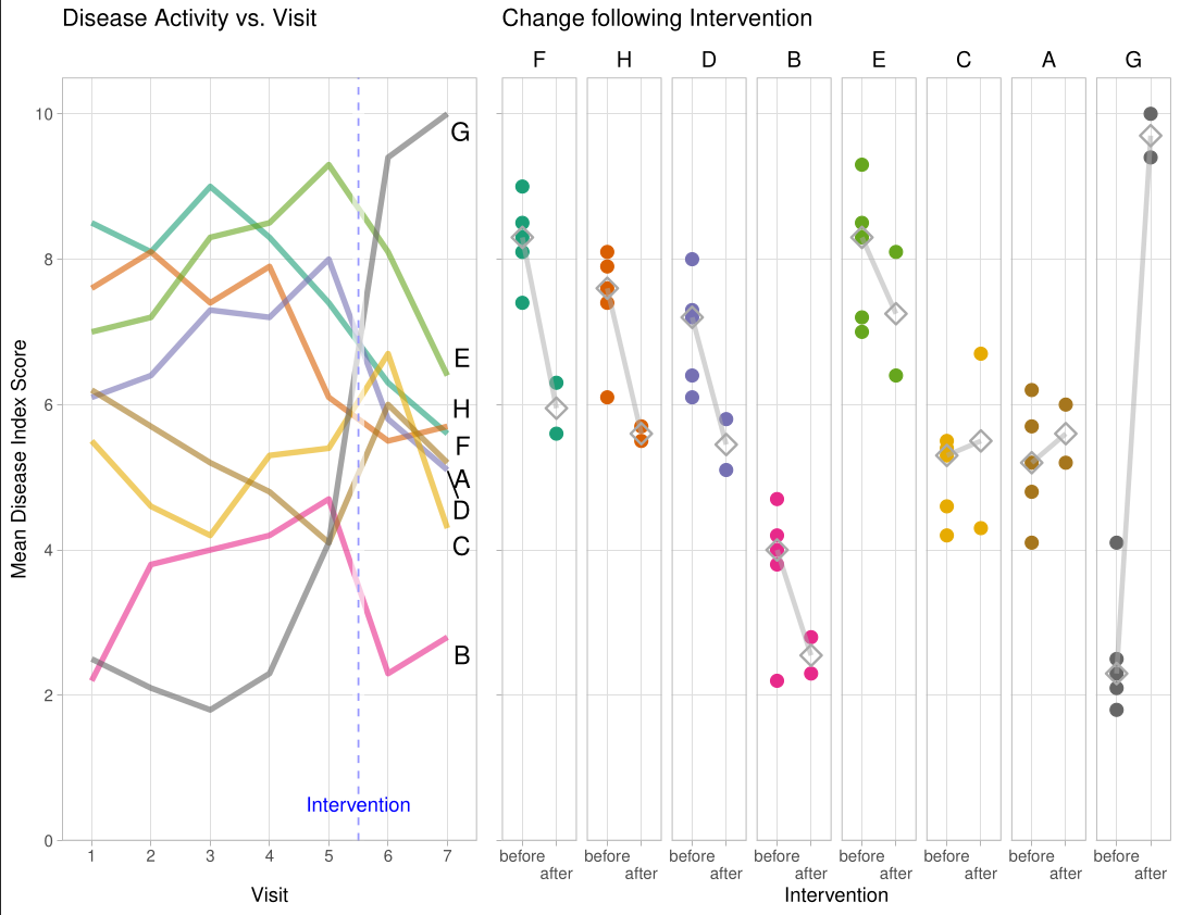 The DLQI is the most frequently used method for evaluating quality of life for patients with different skin conditions. There are 10 questions, covering the following topics: symptoms, embarrassment, shopping and home care, clothes, social and leisure, sport, work or study, close relationships, sex, treatment. Each question refers to the impact of the skin disease over the previous week and is scored from 0 to 3, giving a possible score range from 0 (meaning no impact of skin disease on quality of life) to 30 (meaning maximum impact on quality of life). This month's challenge was to use an effective visualisation to show the effect of treatment on DLQI scores across time points, possibly also reflecting the DLQI's multidimensional nature.