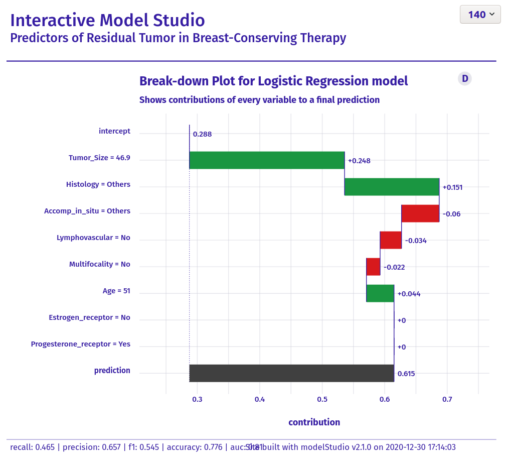 The data set is about a retrospecitve study on finding "Predictors of Residual Tumor in Breast-Conserving Therapy". There are 500 subjects included. The outcome variable is reexcision and it describes, if there has been a reexcision necessary after the (initial) surgery. In a first step, a prediction model for reexcission needed to be set up. The goal of this exercise was to visualize the results. The audience was intended to be a "non-technical" one.
