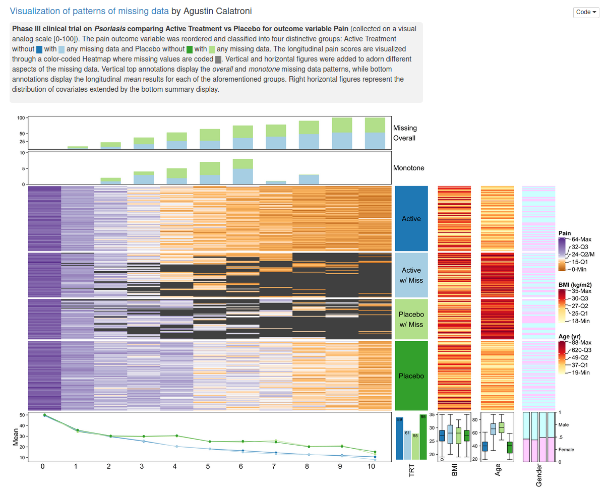 The current example data set is focusing on missing data. Missing data are present in almost any (clinical) data set. Ways to visualize different patterns of missing values is the topic of this webinar / blog entry.