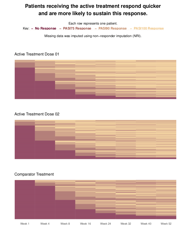 Psoriasis is a chronic, inflammatory skin disease. For such diseases, it is of interest to not only compare treatments in terms of patients achieving a response, but also in terms of patients sustaining this response once it is achieved. This is the focus of this month’s challenge: produce a visualization to compare treatments with regards to patients sustaining a response. The synthetic data contains PASI (Psoriasis Area and Severity Index) scores for three treatment groups: two receive an active treatment in different doses; the third receives a comparator. The three arms are balanced, with 300 patients in each. The data contains PASI scores at Baseline and eight follow-up visits, spread over the course of a year. PASI scores can range from 0 to 72, with higher scores indicating a worse condition state. The criteriafor response can be chosen, but typical thresholds include a 75%, 90% or 100% reduction in PASI scores relative to Baseline (PASI75/PASI90/PASI100). More than one threshold could also be considered in the same visualization.