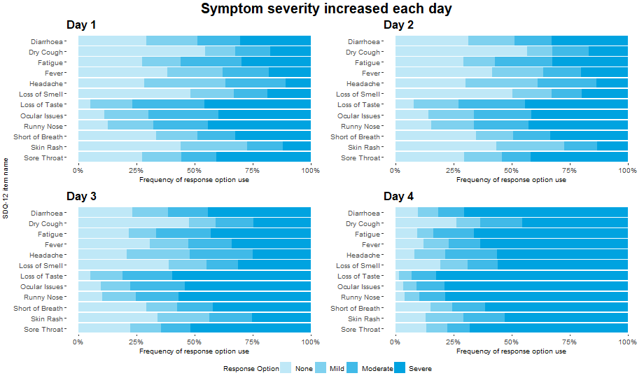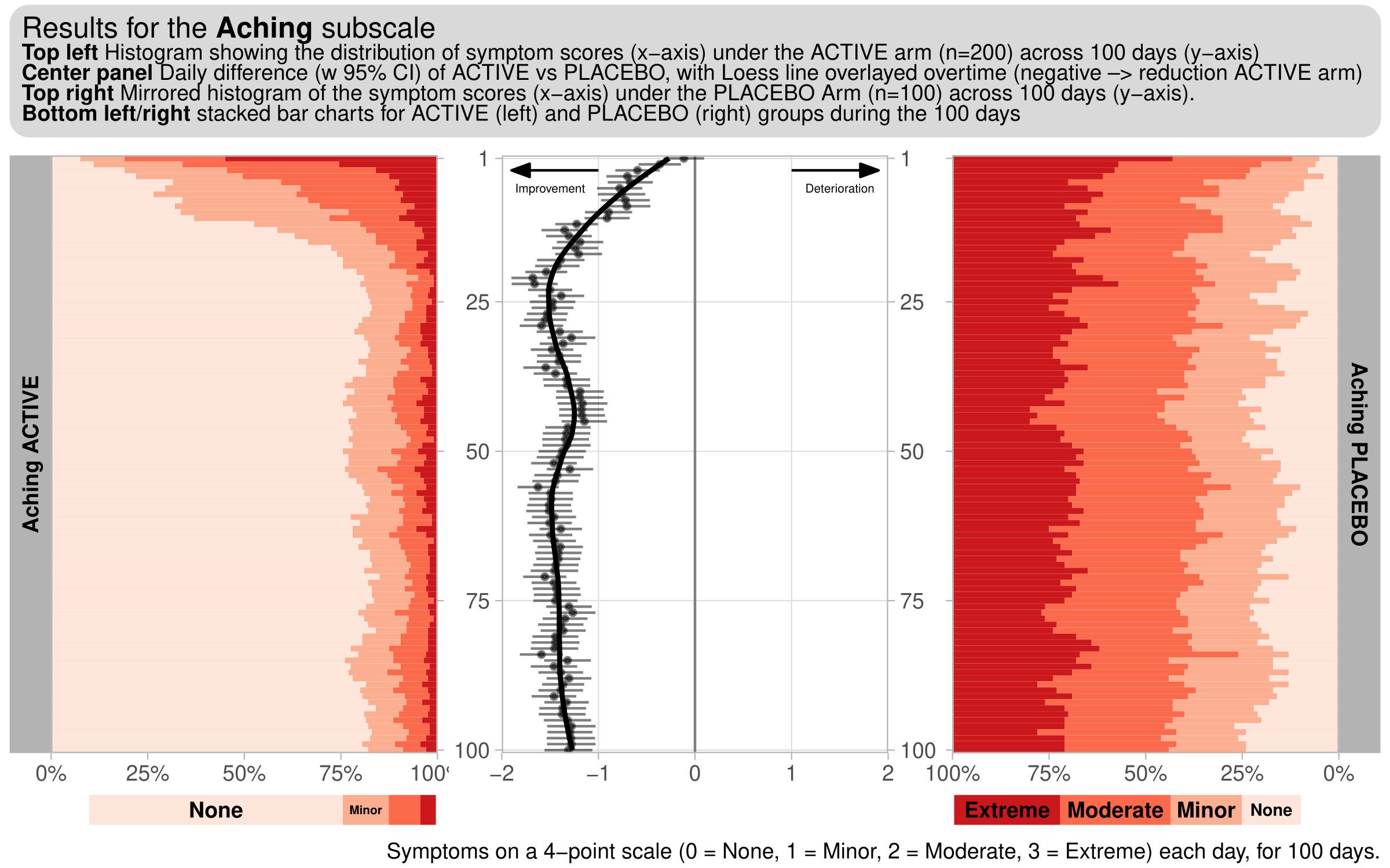 This month’s challenge will be to visualise diary data, whereby patients complete a diary (grading a number of symptoms), each day. For this challenge, we consider a hypothetical diary, consisting of 6 symptoms (Exhaustion, Aching, Tenderness, Depression, Loneliness, Anxiety). 300 subjects (200 active, 100 placebo), grade each of these symptoms on a 4-point scale (0 = None, 1 = Minor, 2 = Moderate, 3 = Extreme) each day, for 100 days.