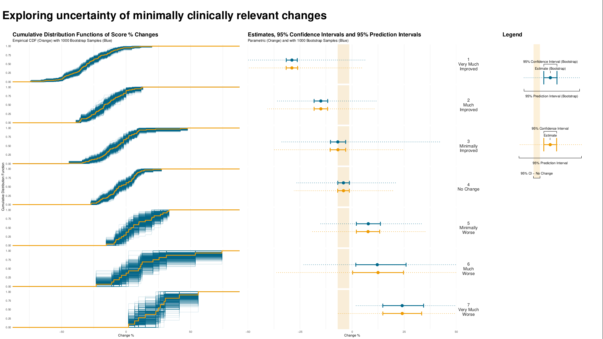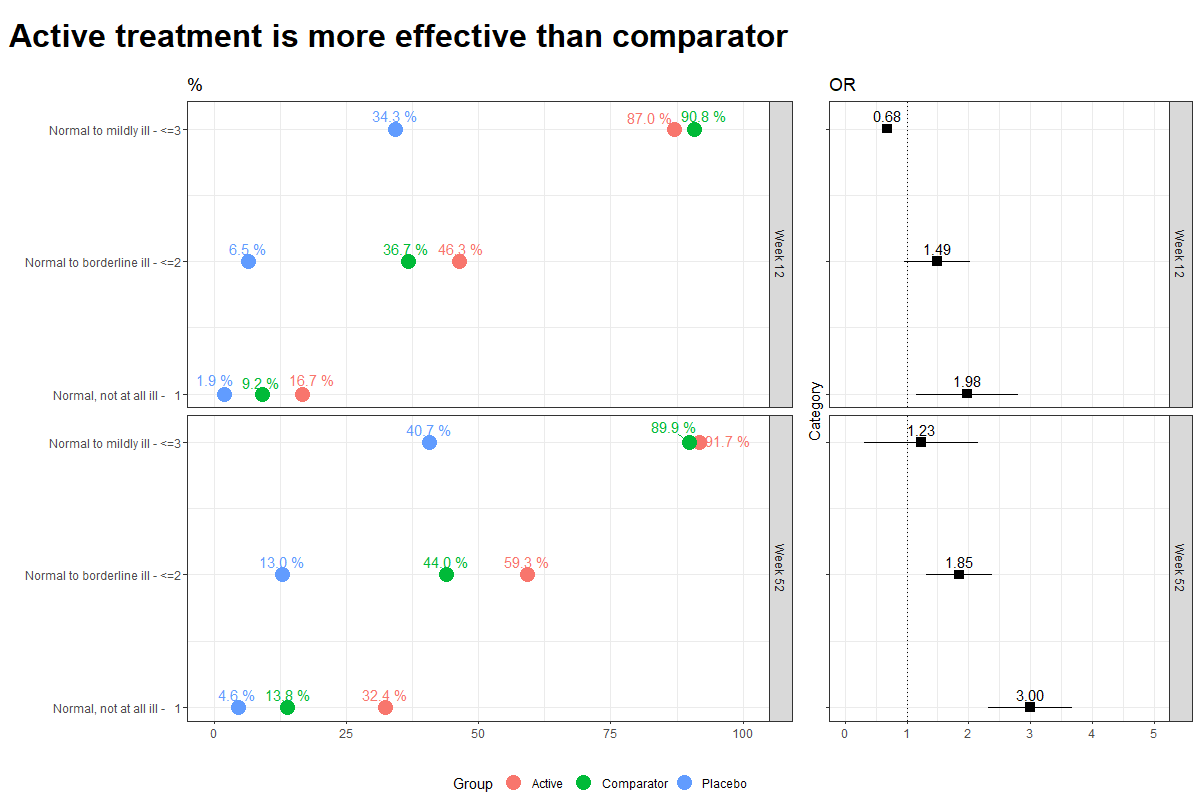 Data visualisations to present Clinical Global Impression Data and to provide comparisons between the different groups (e.g. based on response differences or odds ratios for the different response categories).