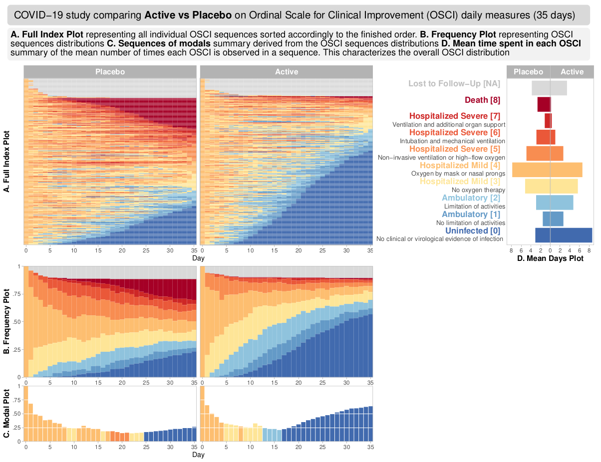 The data reflects a phase III study - active vs placebo and the endpoint was Ordinal Scale for Improvement (OSCI). All patients started at OSCI=4 and daily measures over 35 days were performed. The challenge was to describe the treatment effect specifically taking into account the number and timing of patients who died, left the hospital or fully recovered.