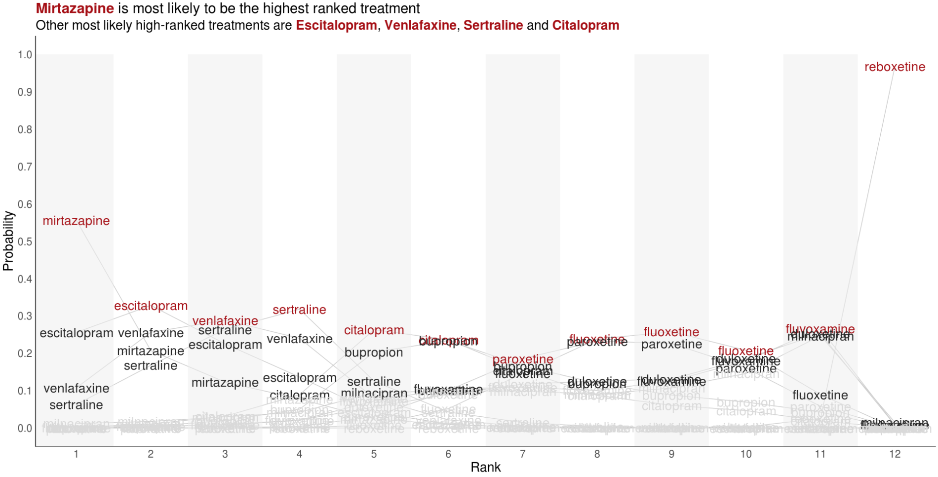 Visualise the relative performance of the treatments based on ranking data. You may want to consider other metrics which can be derived from the ranking data and used to compare treatments.