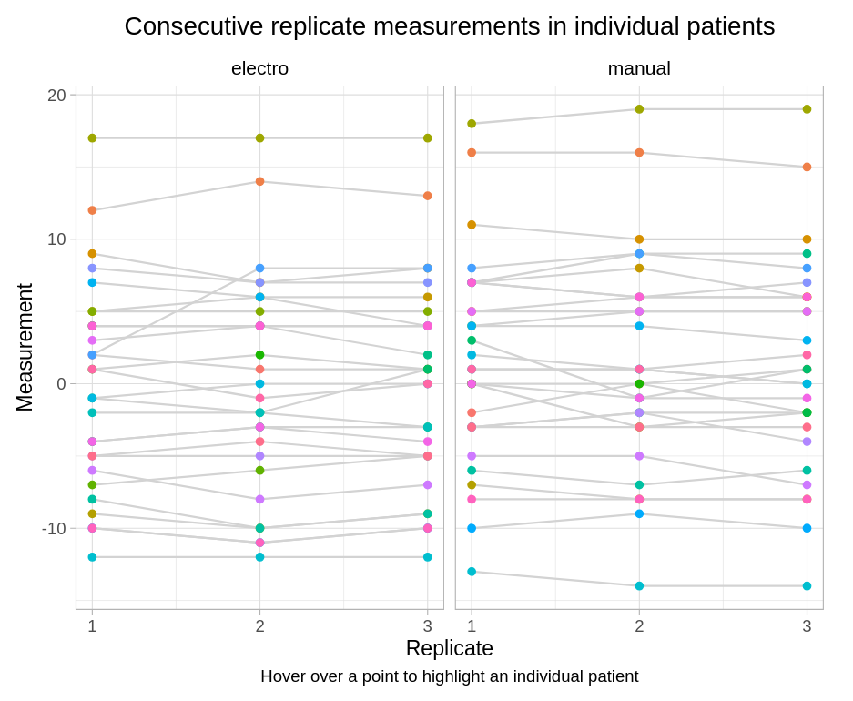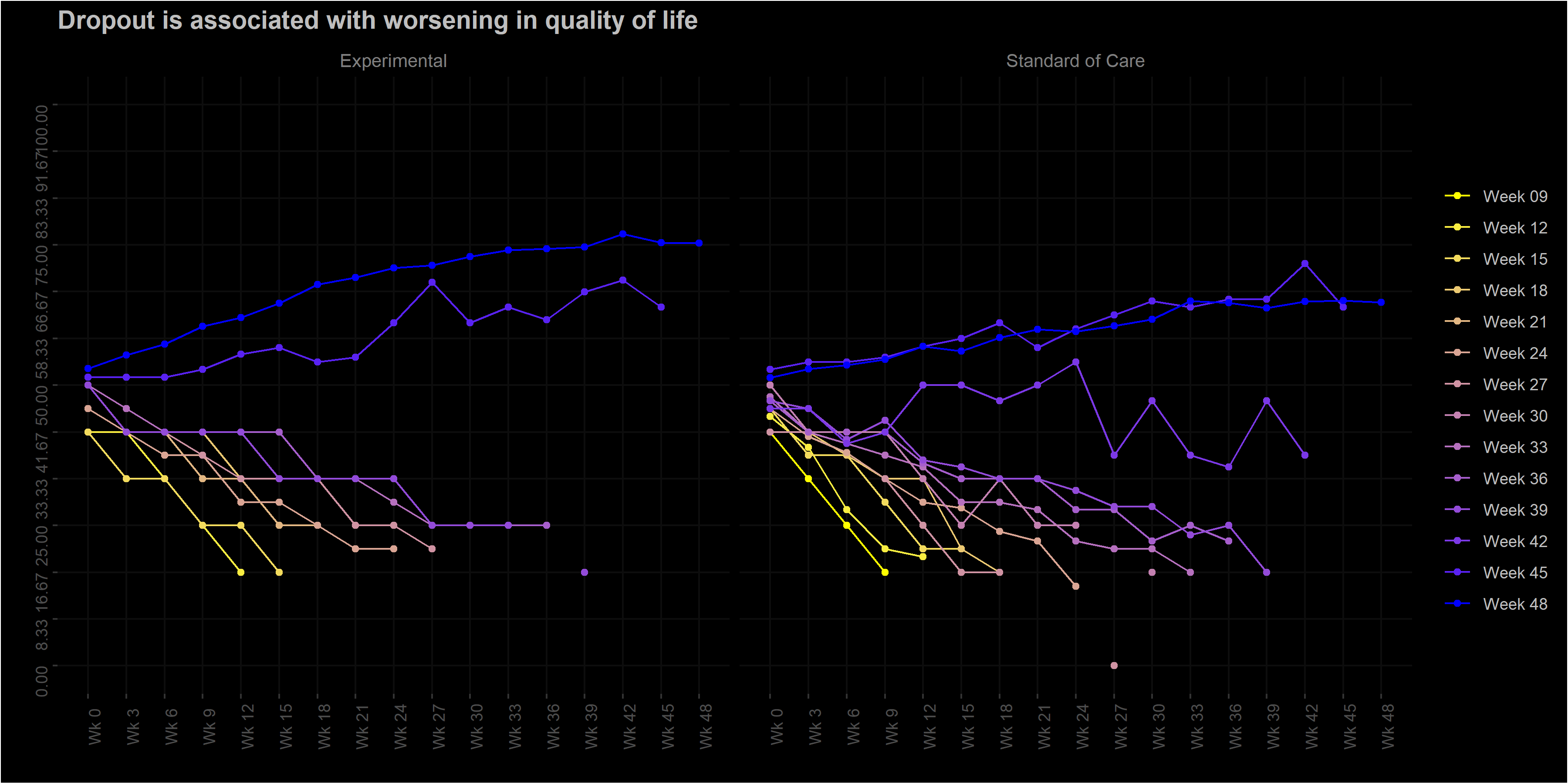 This month's challenge was to summarise changes in haemoglobin (Hgb) concentration over time in patients with anaemia associated with Chronic Kidney Disease (CKD). An experimental medicine was compared with a control group, but in addition to demonstrating efficacy, there was a special interest in visualising intra-individual variability, as large changes in Hgb are a potential safety concern. The visualisations presented ranged from grouped line plots over time, Sankey-diagrams and line plots with quantile bands for summary views and a lasagna plot for the display of individual data. Some general hints were given on how to define suitable color palettes for graphs depending on the type of data. Presented by Steve Mallett.