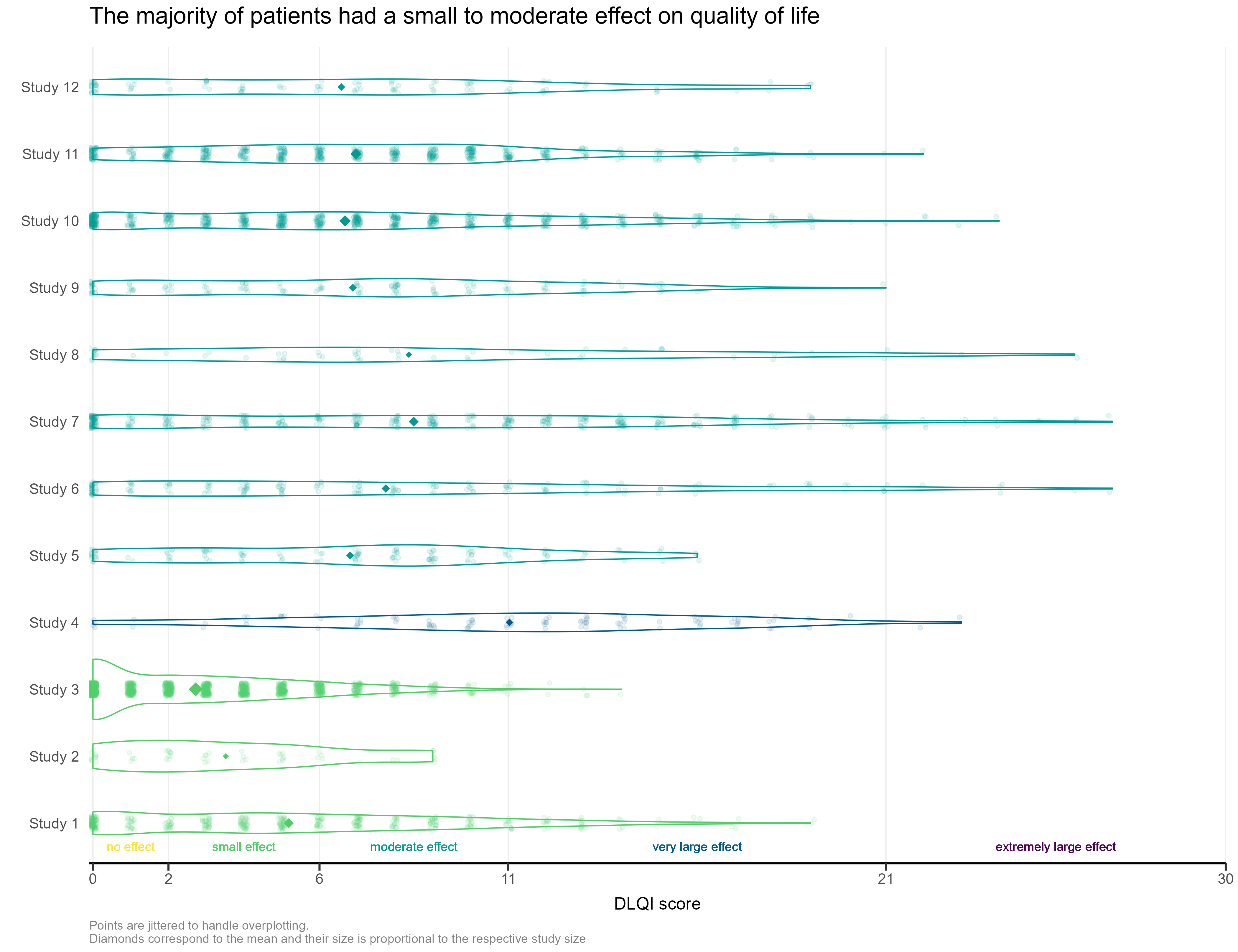 This month’s challenge was to improve a published visualisation. The visualisation displayed the mean (and SD) Dermatology Life Quality Index (DLQI) score for 12 studies on alopecia areata. The publication had visualised these using ‘dynamite plots’, a type of visualisation which has received criticism in the past.