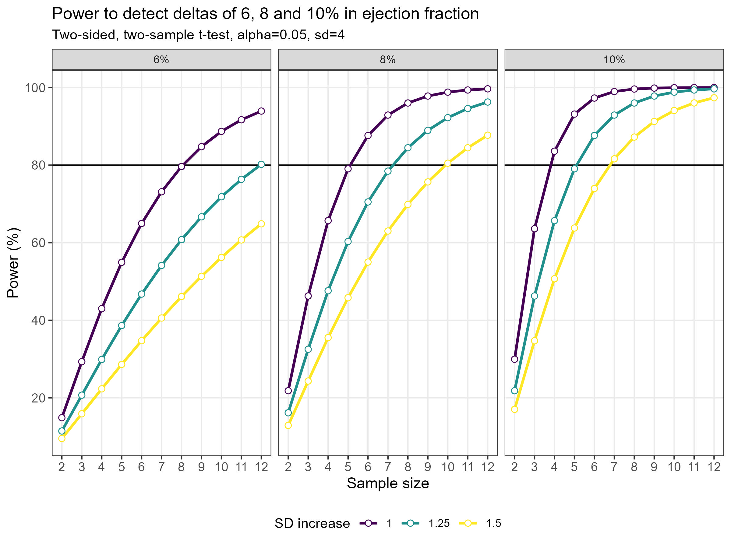 As statisticians, we often have to deal with power or sample size calculations. It can be very beneficial to visualise the impact that different factors have on the sample size or power. Produce data visualisation(s) or share tools that help your audience understand how power and sample size calculations work and what impacts the actual results of these calculations.