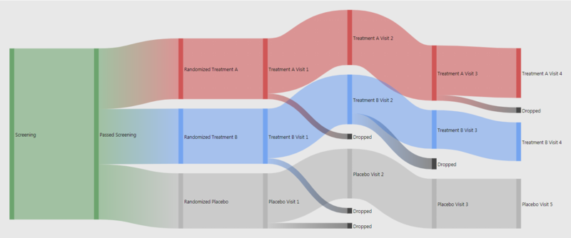 In almost every study there is a flow chart to present the patient's path through the trial. What could the next level of study flow charts look like? Sandard study flow charts are basically organised lookup tables. A true visualisation can do much more. For example colour coding or indenting boxes can help organising. Also additional information can be embedded. This can easily done in R. For patient disposition Sankey diagrams can be extremely useful. This is even more powerful if used interactively. People charts even go without explanation.