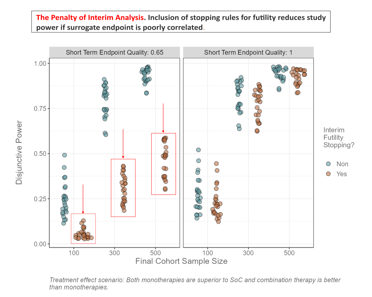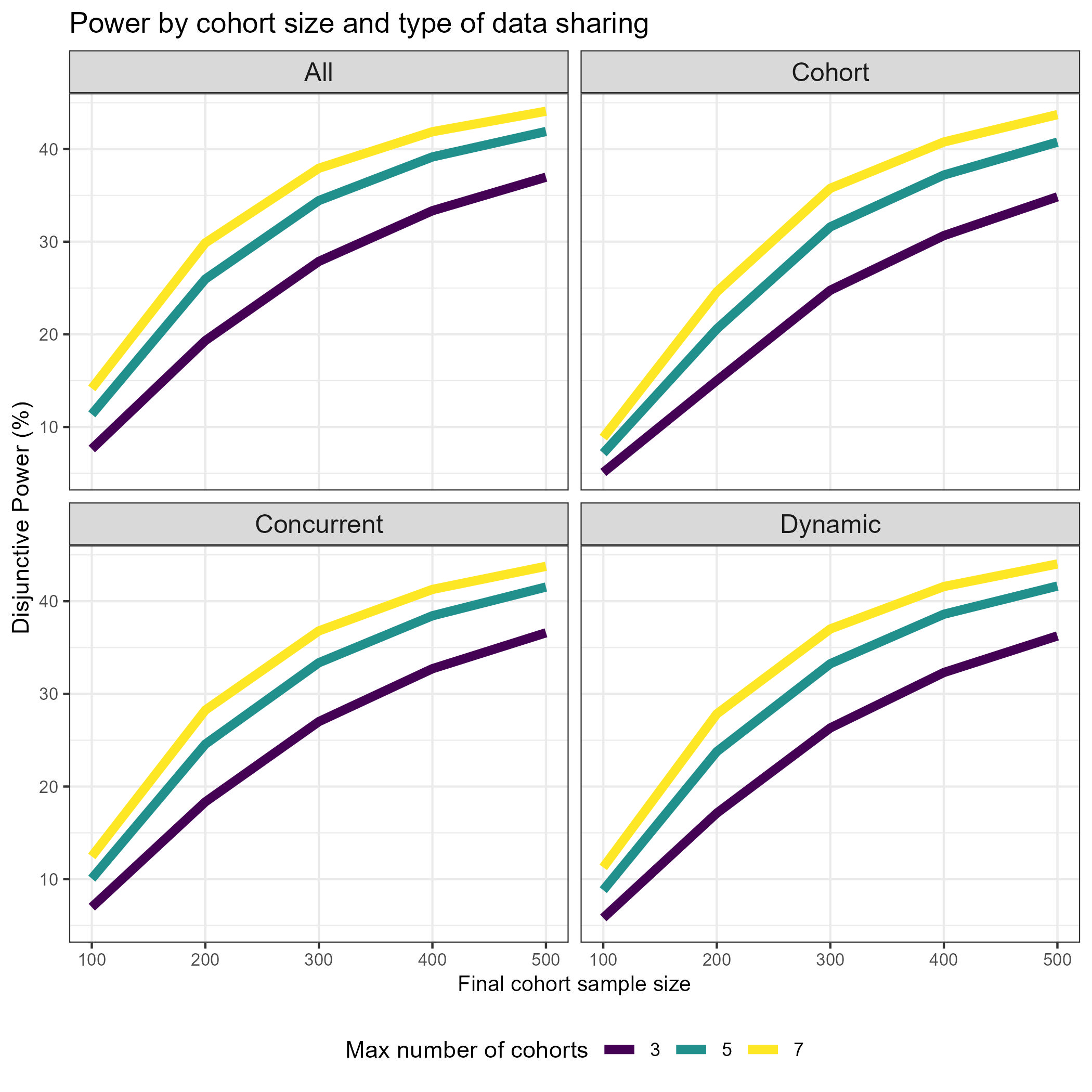 The data set is based on a platform trial design. How can we best show the effect of sample size on the power/type 1 error? Does sample size affect PTP and Disj_Power in the same way? How about in interaction with the type of data sharing? What is the relationship between number of cohorts, cohort inclusion rate and power? How can we investigate the effectiveness of early stopping for futility? What is the relationship between the quality of the surrogate endpoint and the average number of patients enrolled? Is there an interaction with futility stopping and treatment effect scenario? How do FWER and FWER_BA differ from each other with respect to treatment effect scenario and maximum number of cohorts? Can you find other interesting patterns in the data?